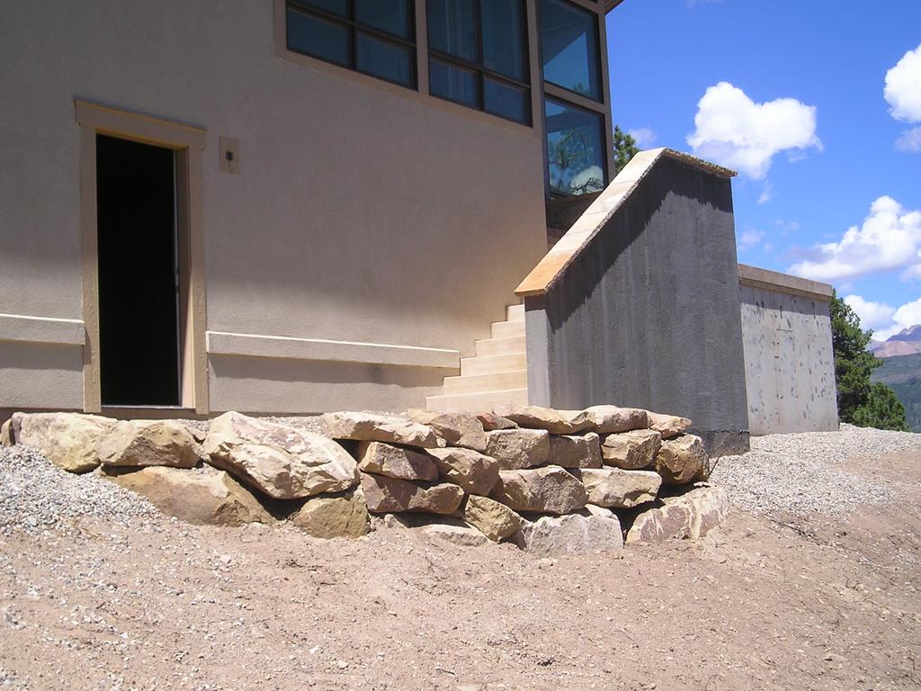 The rock work at the bottom of the back stairs. Notice the flagstone