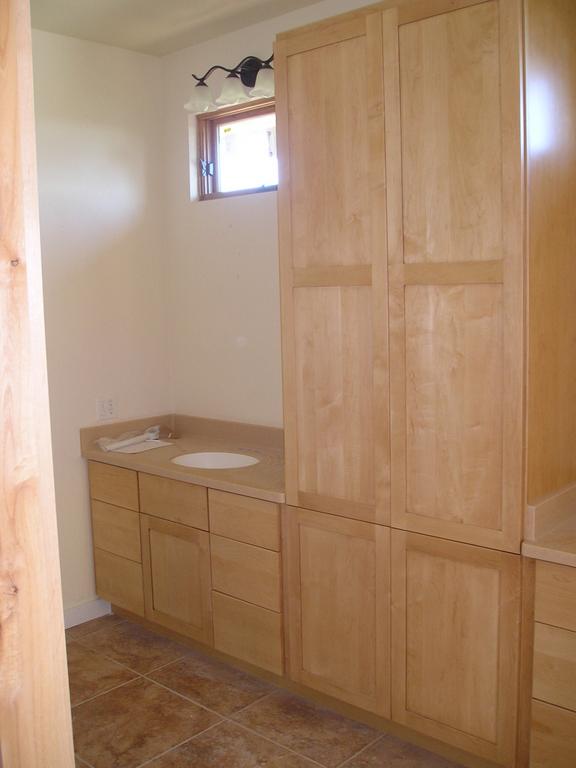 Master bathroom vanities and cabinets. Surface tops are Mojave color of Corian. Notice